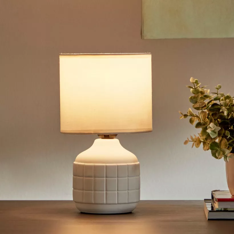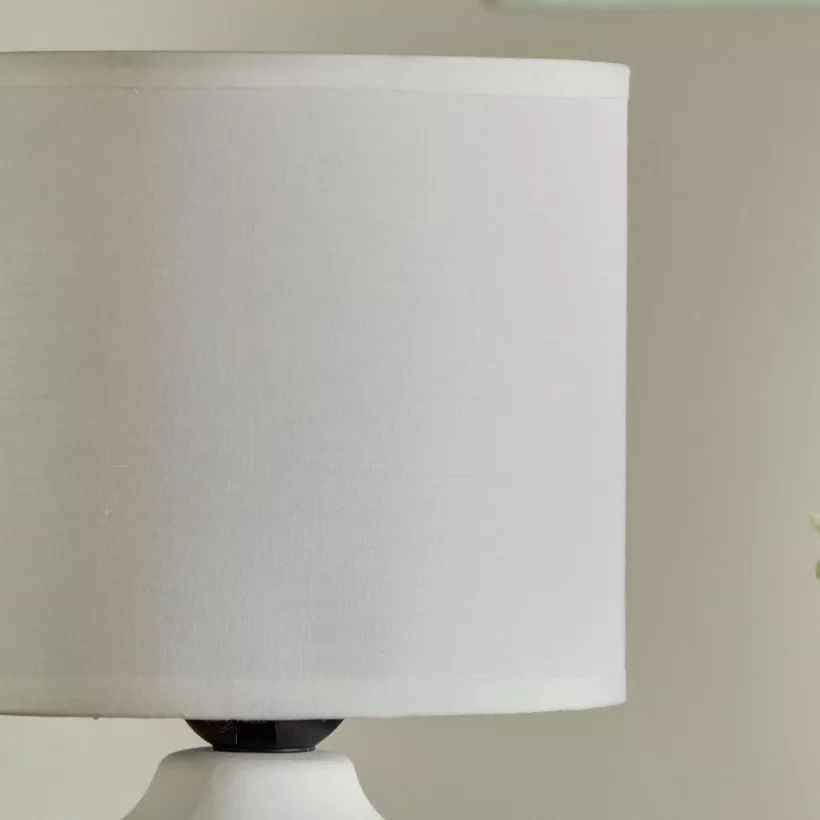 Flaunt your love for modish flair with this table lamp among your home decor. The lamp base is crafted from ceramic with a pristine hue and tonal grid pattern. A matching drum shade sits atop the lamp to lend a soft glow to spaces. Place it anywhere from an accent table to a nightstand to instantly spruce up a room.