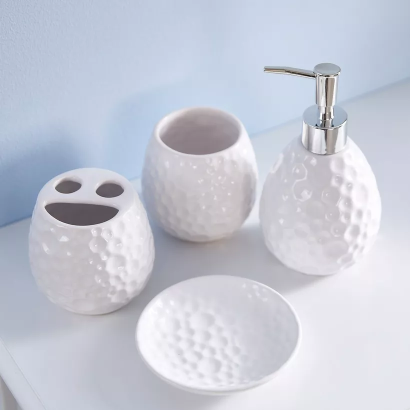 Consisting of a soap dispenser, toothbrush holder, tumbler and soap dish, this four-piece bath set is a great way to complete the look of your contemporary bathroom. Crafted from ceramic and designed to resemble the texture and look of a golf ball, this durable set comes in a light colour tone which makes it mesmerising and visually pleasing.