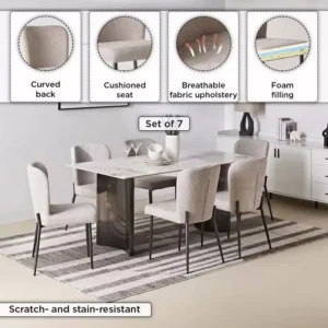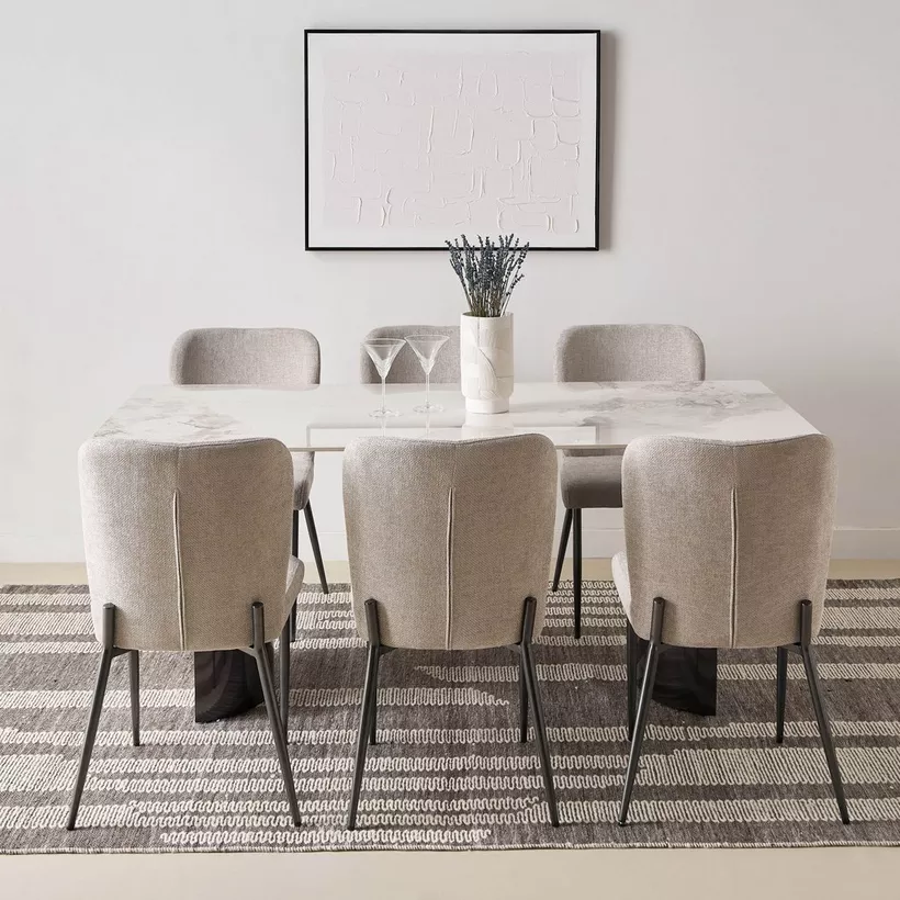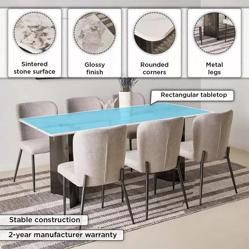 Elevate your dining experience with this furniture set. It includes a spacious sintered stone top table that is both scratch and stain-resistant, making it perfect for everyday use. The metal legs provide a sturdy base and add a touch of contemporary style. This set includes six chairs, each with comfortable fabric upholstery and foam filing for added support and cosiness.