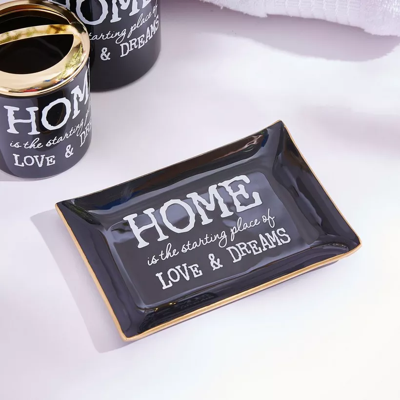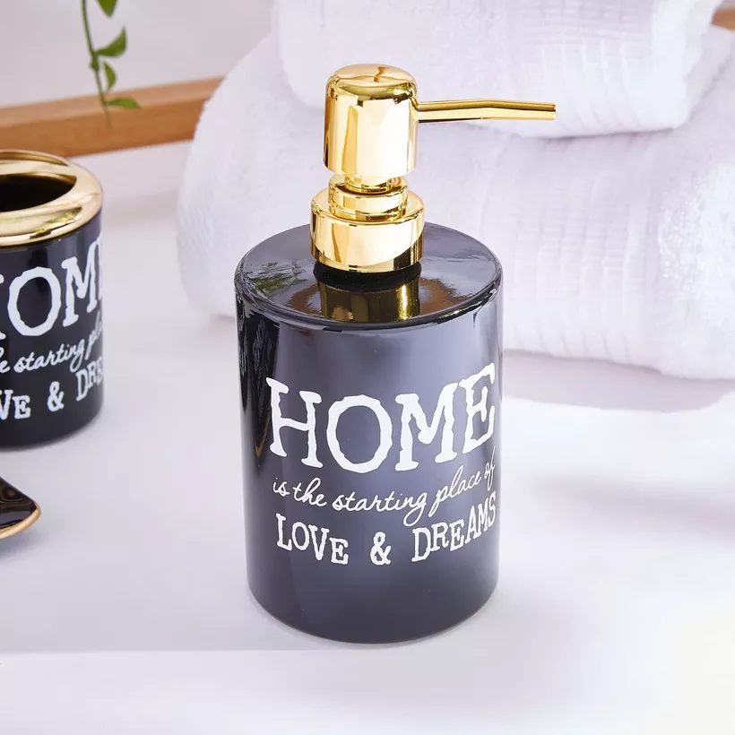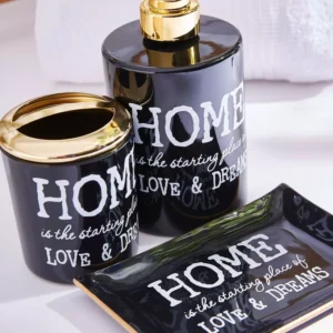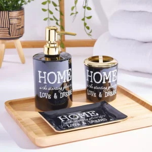 Lend a jazzy flair to your bathroom set-up with this attractive bath accessory set. It is inclusive of a tray, a soap dispenser, and a toothbrush holder. The contents of the set are made of glass and beautified with a cheery slogan print in a modish font. They can be wipe cleaned for regular upkeep.